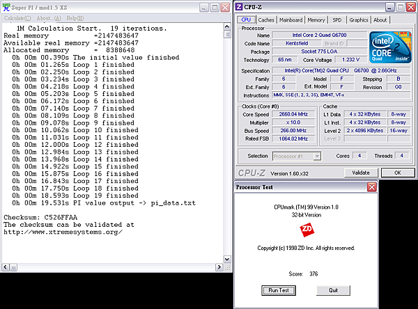 預設值2.66GHz下, CPUMARK99跑376分, SuperPI 1M跑19.5秒