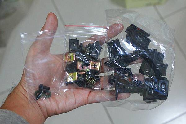 包括貴鬆鬆的原廠遮陽板螺絲組, 隨車殼附贈的螺絲墊片包, 以及有夠便宜的副廠開關組