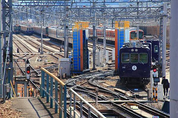 列車常常得跨越這樣的橫渡線才能出發, 話說我還真猜不出來這列車的車種和目的地...