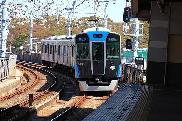 四輛編組的神戶電鐵5000系, 神戶電鐵的系統是1067mm窄軌, 不同於阪神等使用的1435mm標準軌