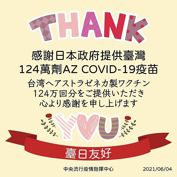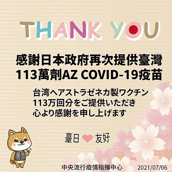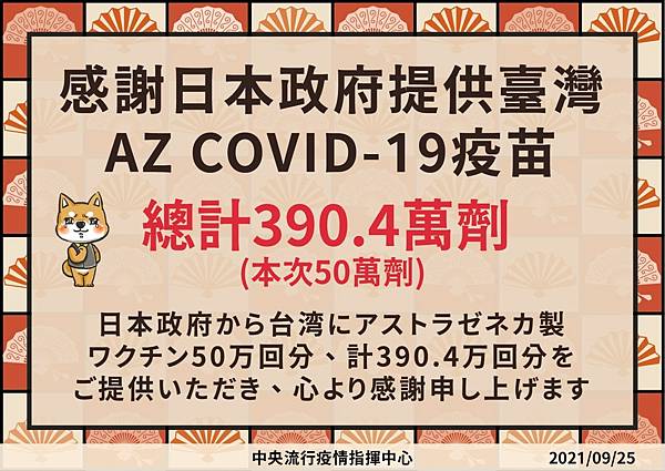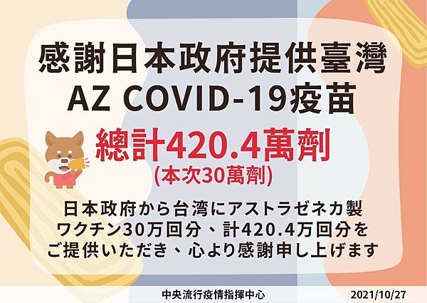 再加上先前的兩批, 日本已經援台超過330萬劑的AZ疫苗了, 實在是非常感謝!!