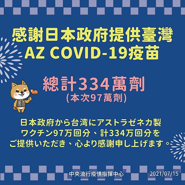 題外話, 就在同一天(7/15), 除了日本援助的97萬劑AZ疫苗之外