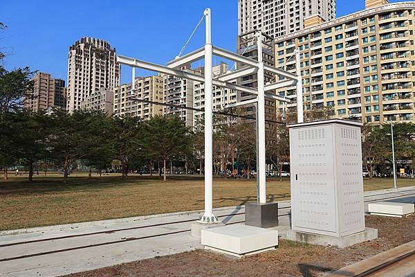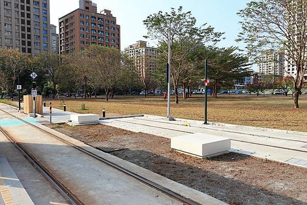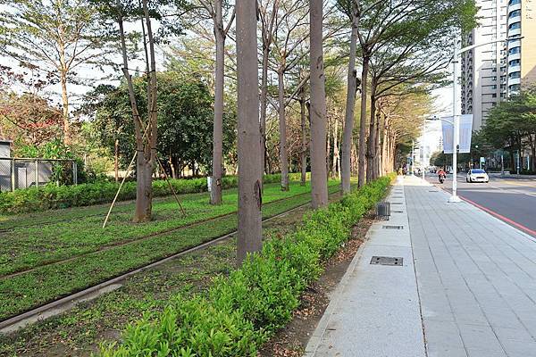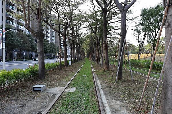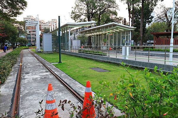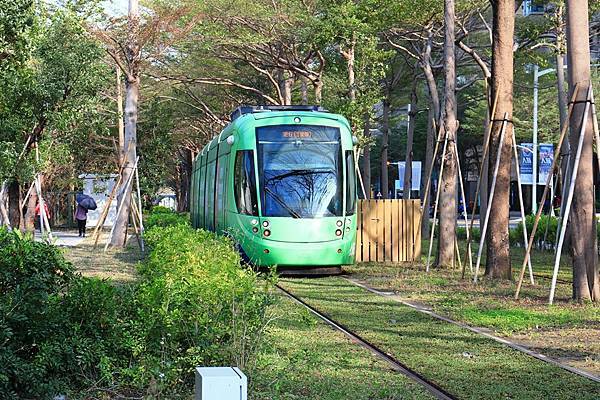 此外由於為了避免佔用道路的空間, 這一段的輕軌路廊是位在美術館的園區內