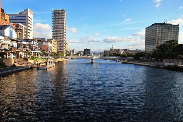 從橋上沿著紫川往南望去, 可以看到為了紀念森鷗外而命名, 造型特別的鷗外橋