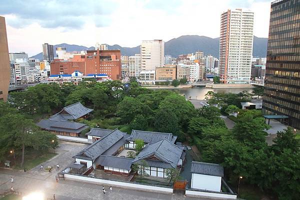 古色古香的庭園, 和背景裡高樓大廈的北九州市役所呈現著強烈的反差