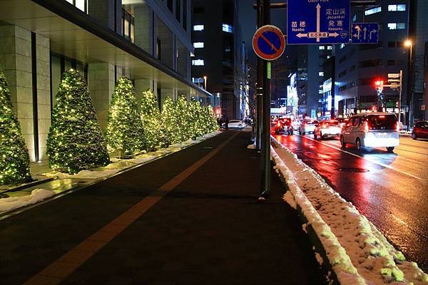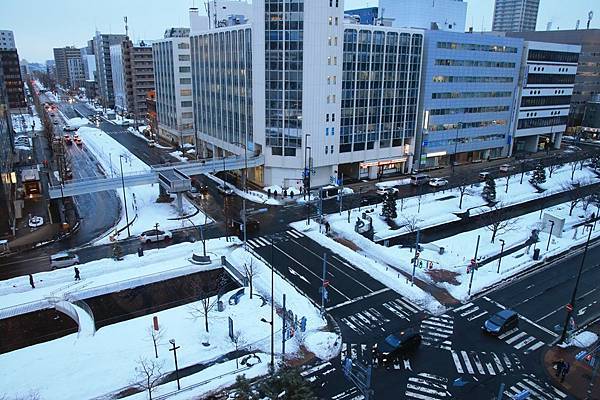 中間的創成川兩旁被白雪覆蓋著, 不知道水面是否也結冰了?